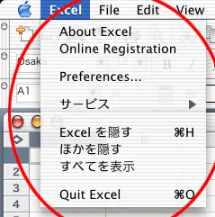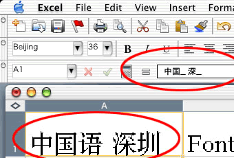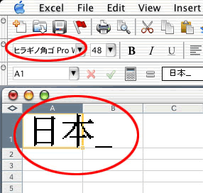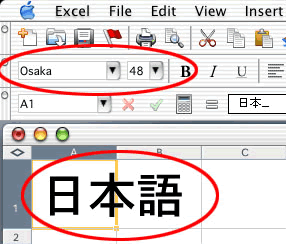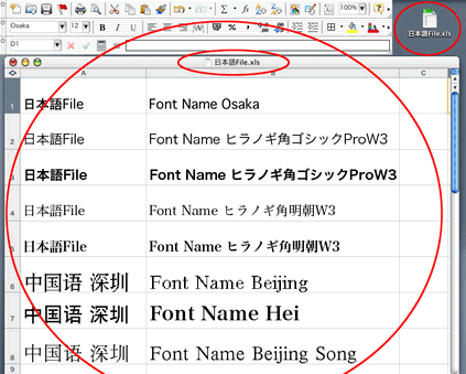 - セル上の日本語は、Osaka フォントを指定する必要がある。但し数式バーの部分は文字化けする。(中文と共通でない日本字が表示できない。)